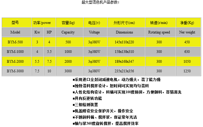 大型混色機特點: 1、螺旋循環(huán)攪拌使得原料混合更加均勻、快速; 2、適用于各種塑料原料與色母的混合攪拌,新、舊料及色母混合則效果更佳; 3、設備與原料所接觸部分的材料皆為全不銹鋼制作,清洗容易,避免銹蝕; 4、設有電控安全保護裝置,確保操作安全。 工作原理: B立式攪拌機的工作是利用螺桿的快速旋轉將原料從桶體底部由中心提升至頂端, 再以傘狀飛拋散落,回至底部,這樣原料在桶內上下翻滾攪拌,短時間內即可將大量原料均勻的混合完畢。